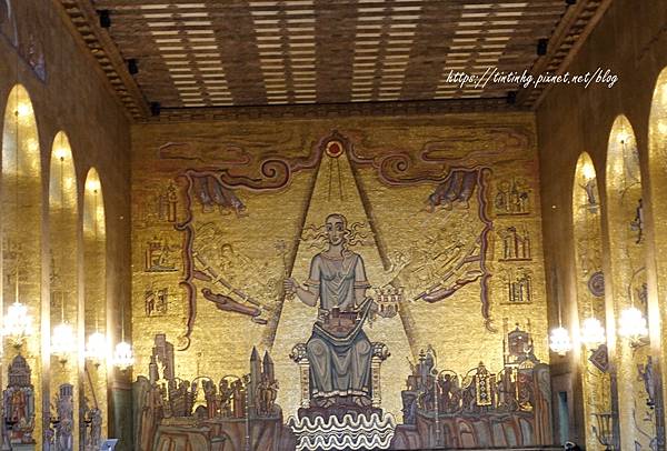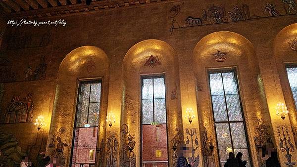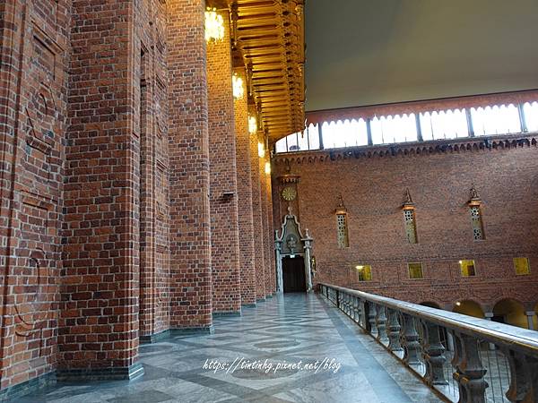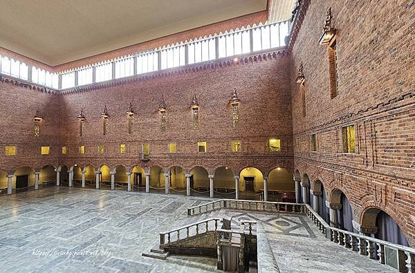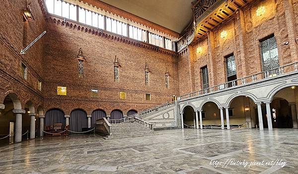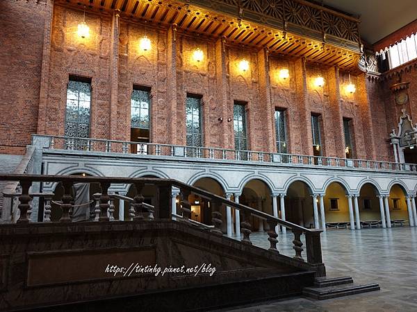藍廳大廳非藍色,在建築之初原鋪上藍色馬賽克,故把它稱為藍色大廳 Blå hallen,但後來他看見美麗的紅磚時,便改變主意,大家都已習慣稱之為藍廳,沿用至今,是諾貝爾獎每年12月10號晚宴舉辦地點,二樓是金廳,金廳燈的上面有一座斯堪地那維亞地區最大型管風琴共有10270支音管 ,晚宴舉辦時會有1200~1500名嘉賓蒞臨,學生可以花 5 歐元抽籤,中獎後可以付費參加晚宴,但只能坐在門外的廣場 ,另類的參與,導覽說每個人用餐空間只有60~65公分,空間不大人貼著人坐其實很不舒服