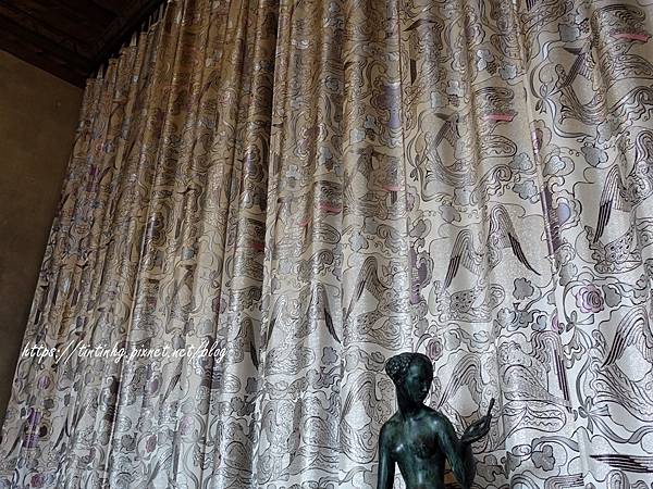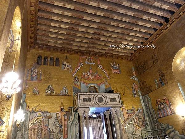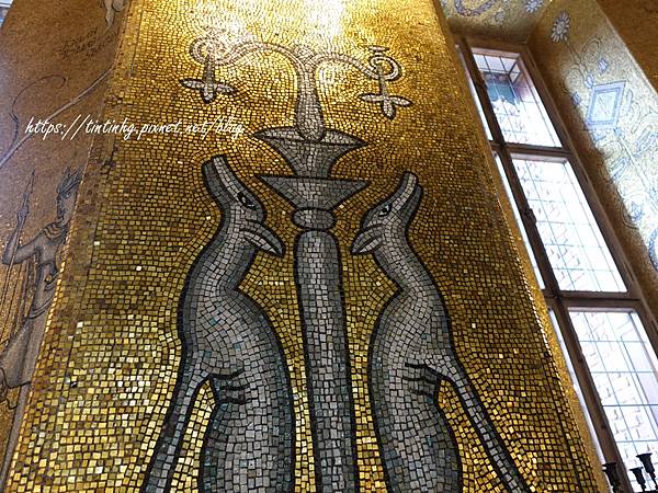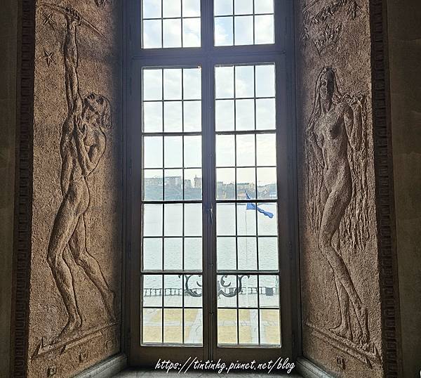 每扇窗戶邊,都有一男一女的壁畫,北歐古典神話中各種男女人物浮雕
