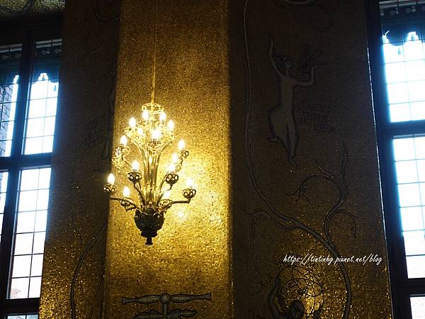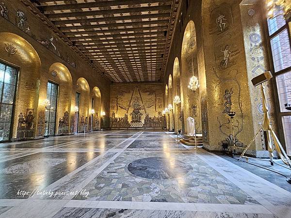 長達44米(144英尺) 牆壁和壁畫由1800萬塊玻璃和黃金砌成, 當建築師拉格納·奧斯特伯格Ragnar Östberg提議由藝術家艾納·弗塞斯Einar Forseth創作馬賽克裝飾,該廳因牆壁的金色裝飾而得名,也被稱為跳舞廳,諾貝爾晚宴後舞會的地點