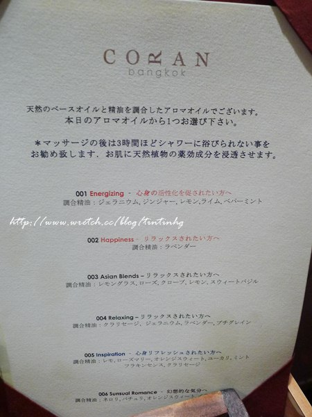 有很多種精油可以選擇,但我寫信選的是綠茶磨沙去角質精油按摩spa 90分鐘1150B,所以就不能選要那種精油了。